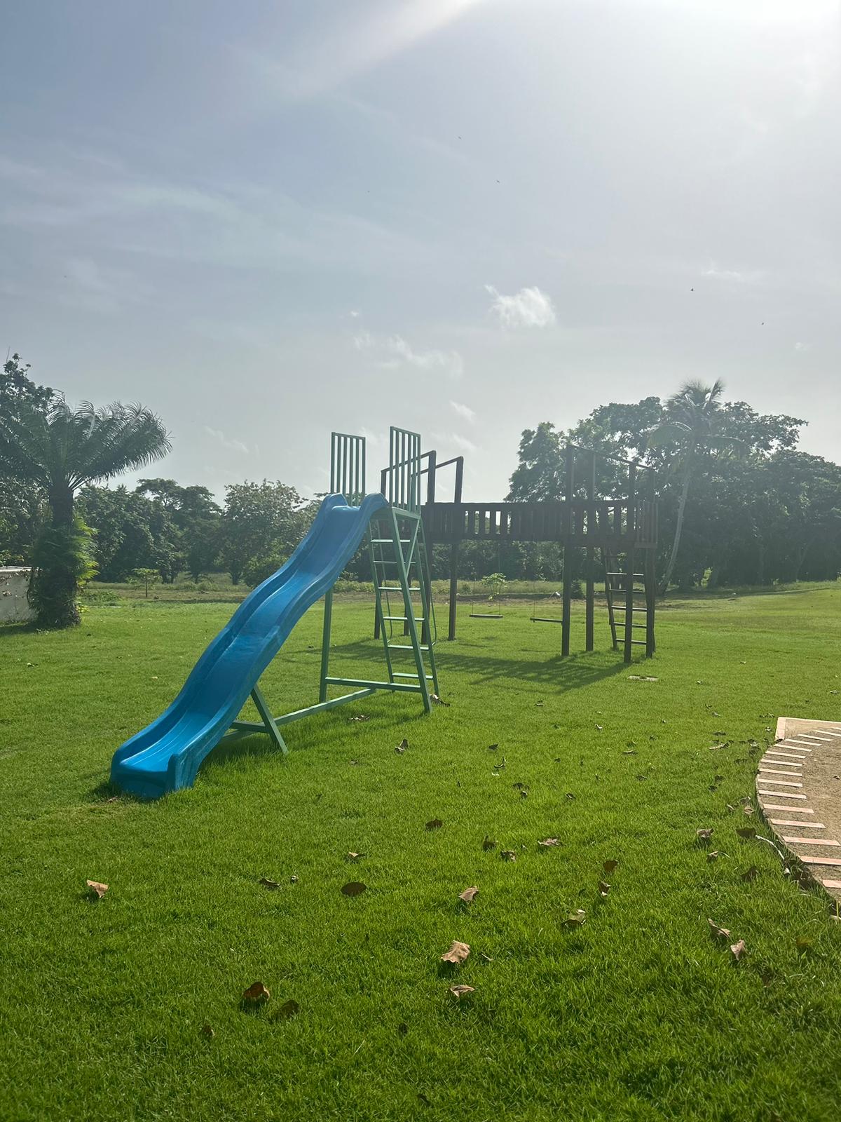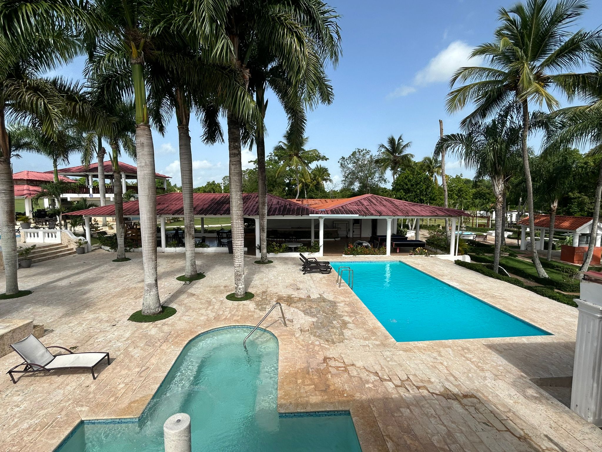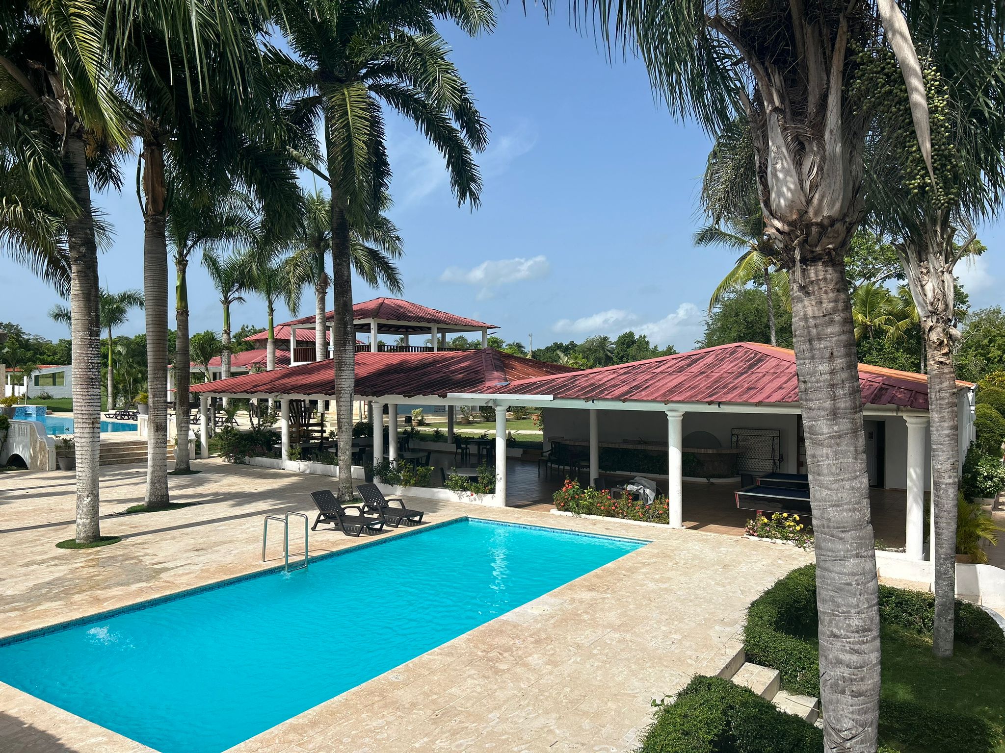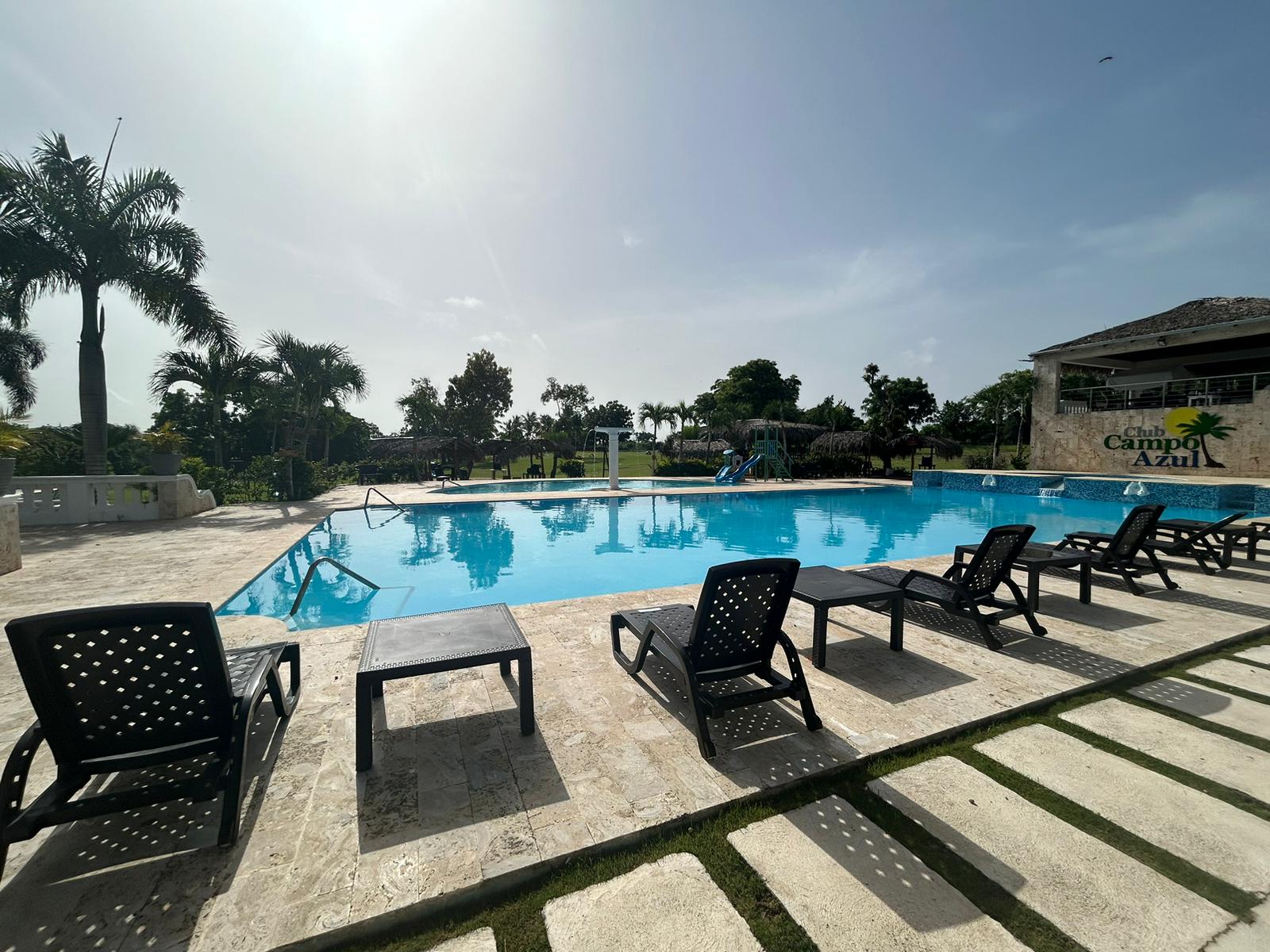 Club Campo Azul offers a unique retreat for visitors. Guests can relax by the pool, soak up the sunshine, listen to music, and take a refreshing dip. The complex is surrounded by beautiful flowers and coconut trees, creating a tropical garden atmosphere. There is also a kiddie pool and a mini playground for children to explore. Additional amenities include horseback riding for those seeking adventure. The best part is that services are available to both members and non-members of the club. Visitors can opt for a day pass, which may include breakfast depending on the chosen package. The facility features a restaurant and bar, offering a wide selection of dishes and drinks. Conveniently located at the entrance of Ramon Santana, this location provides a perfect retreat for relaxation with family and friends.